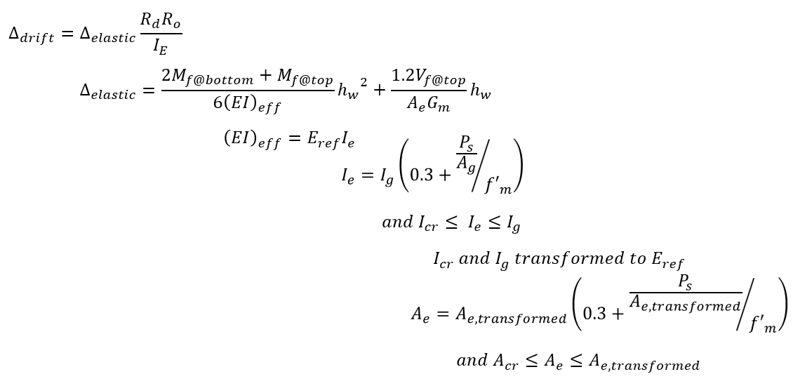 Although some non-linear behaviour has been considered through the use of an effective bending stiffness discussed earlier, the building code requires that deflections used to compare to drift limits be multiplied by the following term, taking into account the over-strength and ductility SFRS force modification factors used to determine the applied loads, as well as the importance category, shown below:
