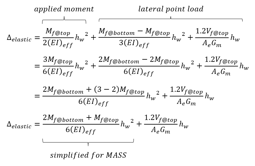 For an individual shear wall, the deflection is determined as a function of bending stiffness and applied loading, where the loading is expressed in terms of the moment at the top and bottom of the wall. There are multiple ways to calculate and express this deflection where the simplified version is displayed by MASS: