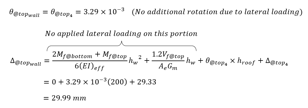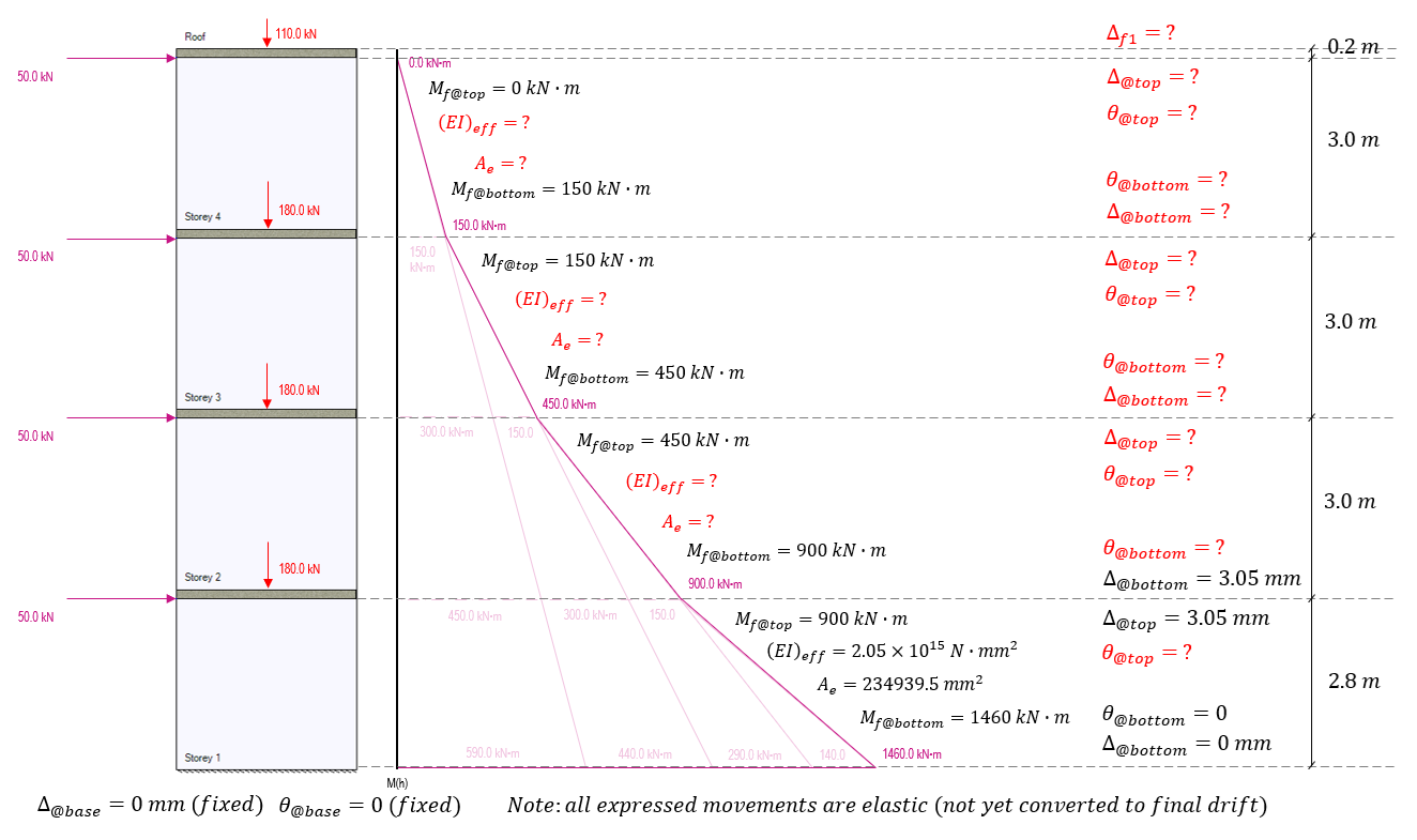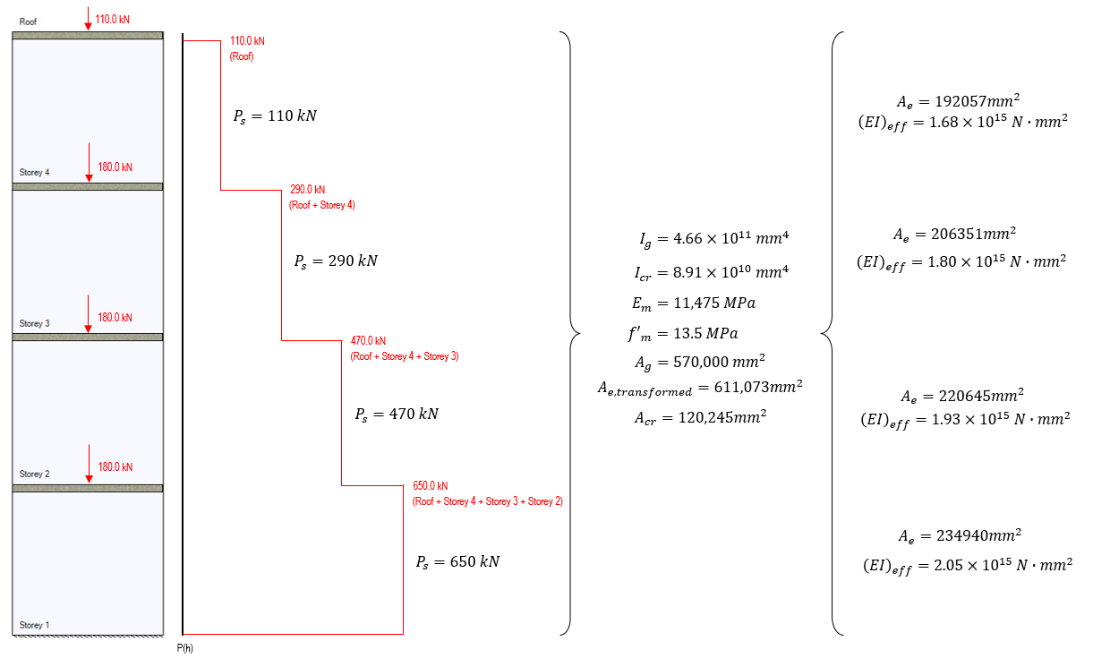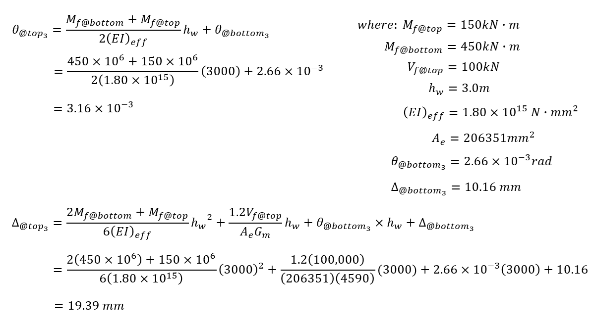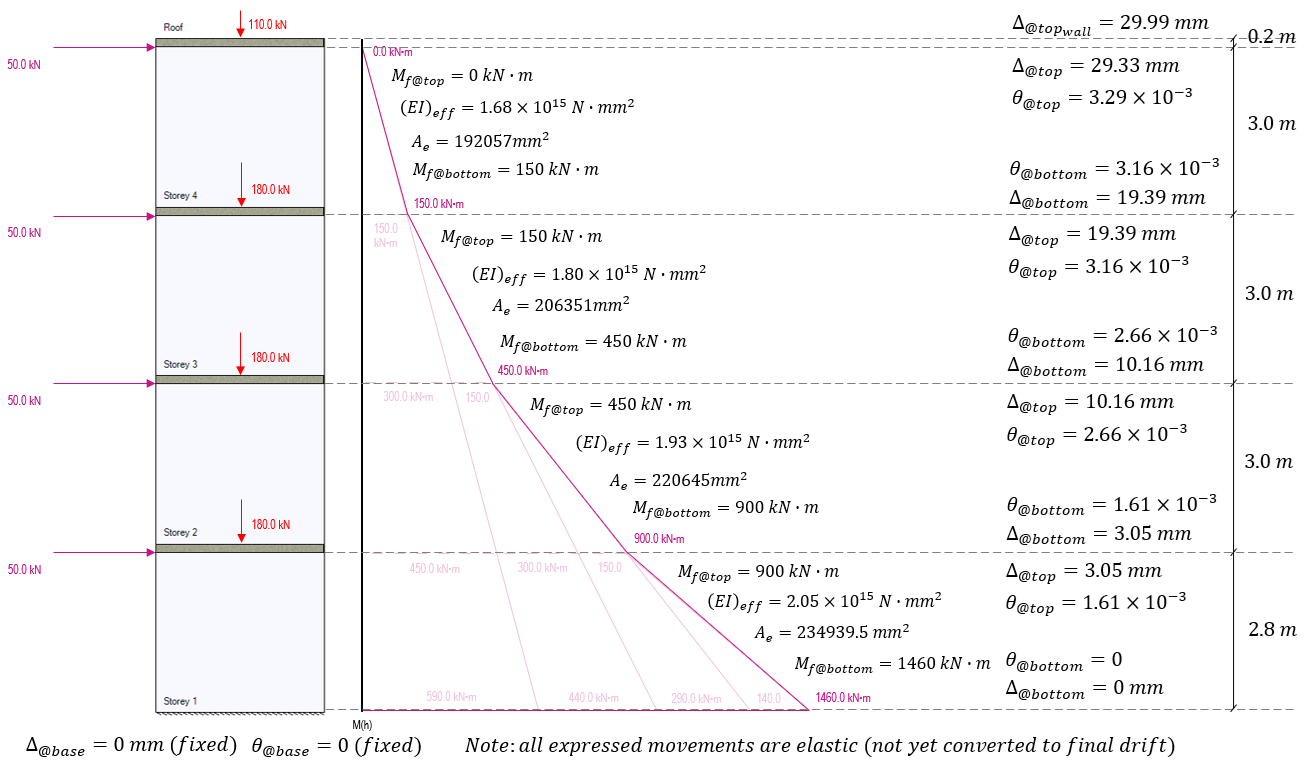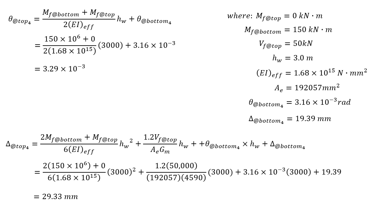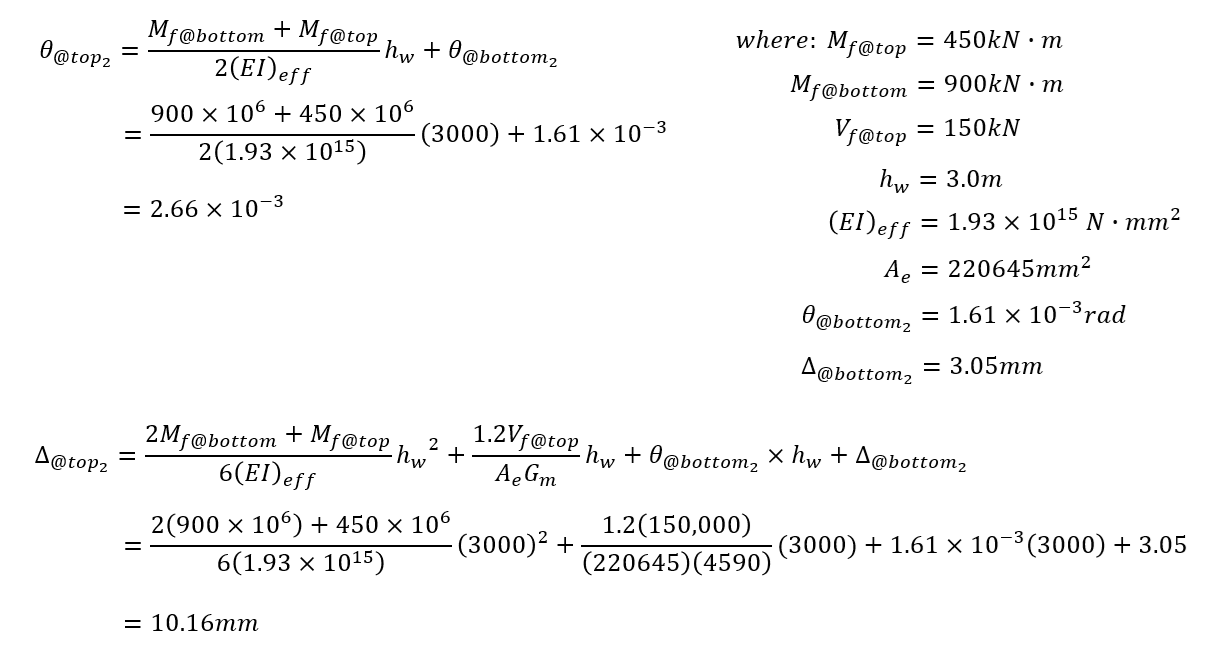 Recall that the physical area occupied by floor slabs between shear walls uses the effective stiffness for the shear wall resting upon it. These effective bending stiffness and area values can be used to work up the shear wall, starting from the second storey where the elastic rotation and deflection have already been determined, as shown below: