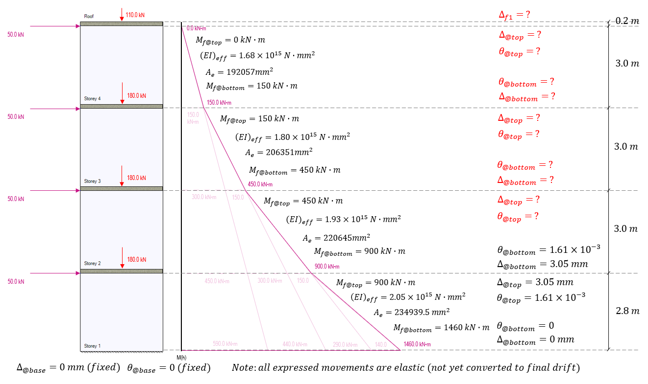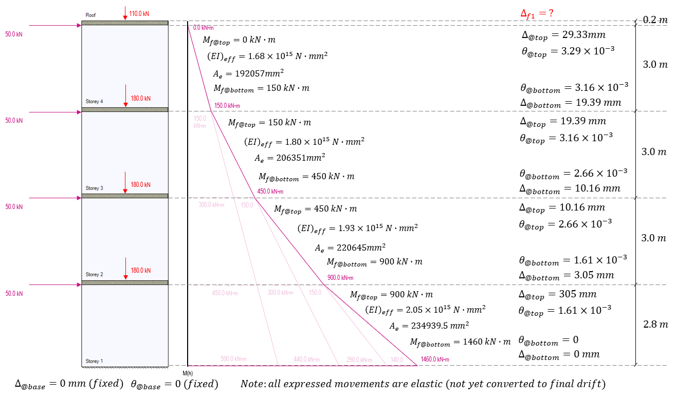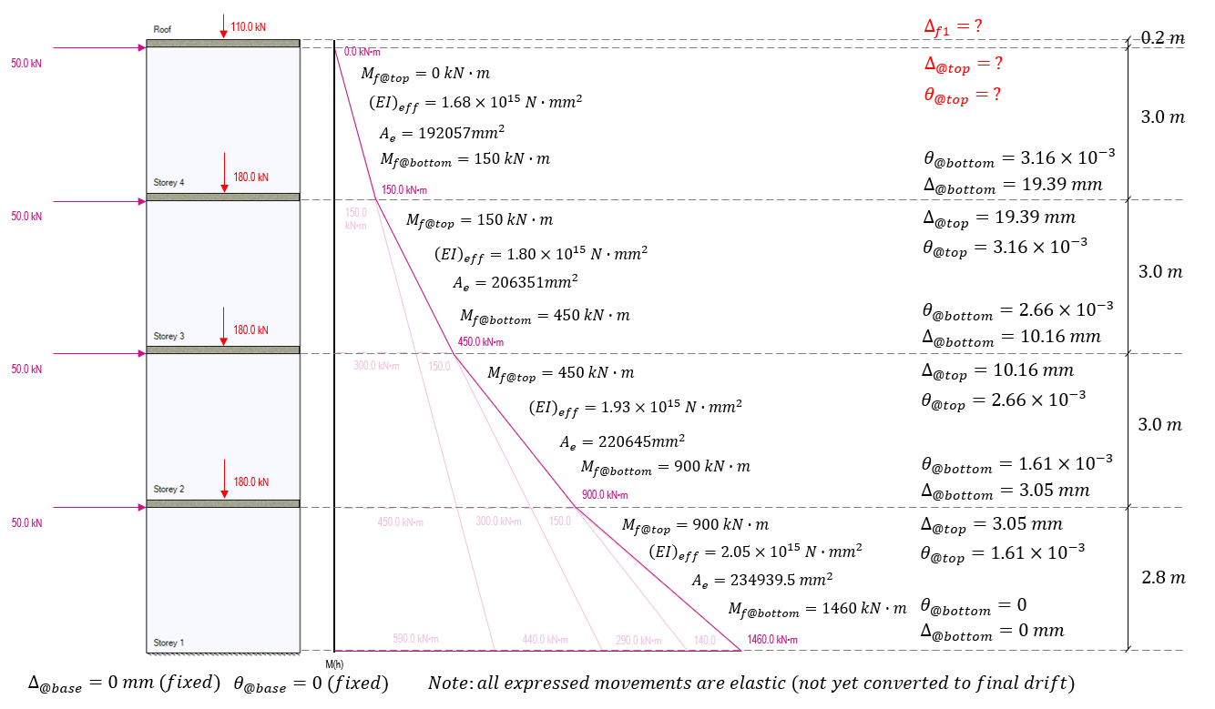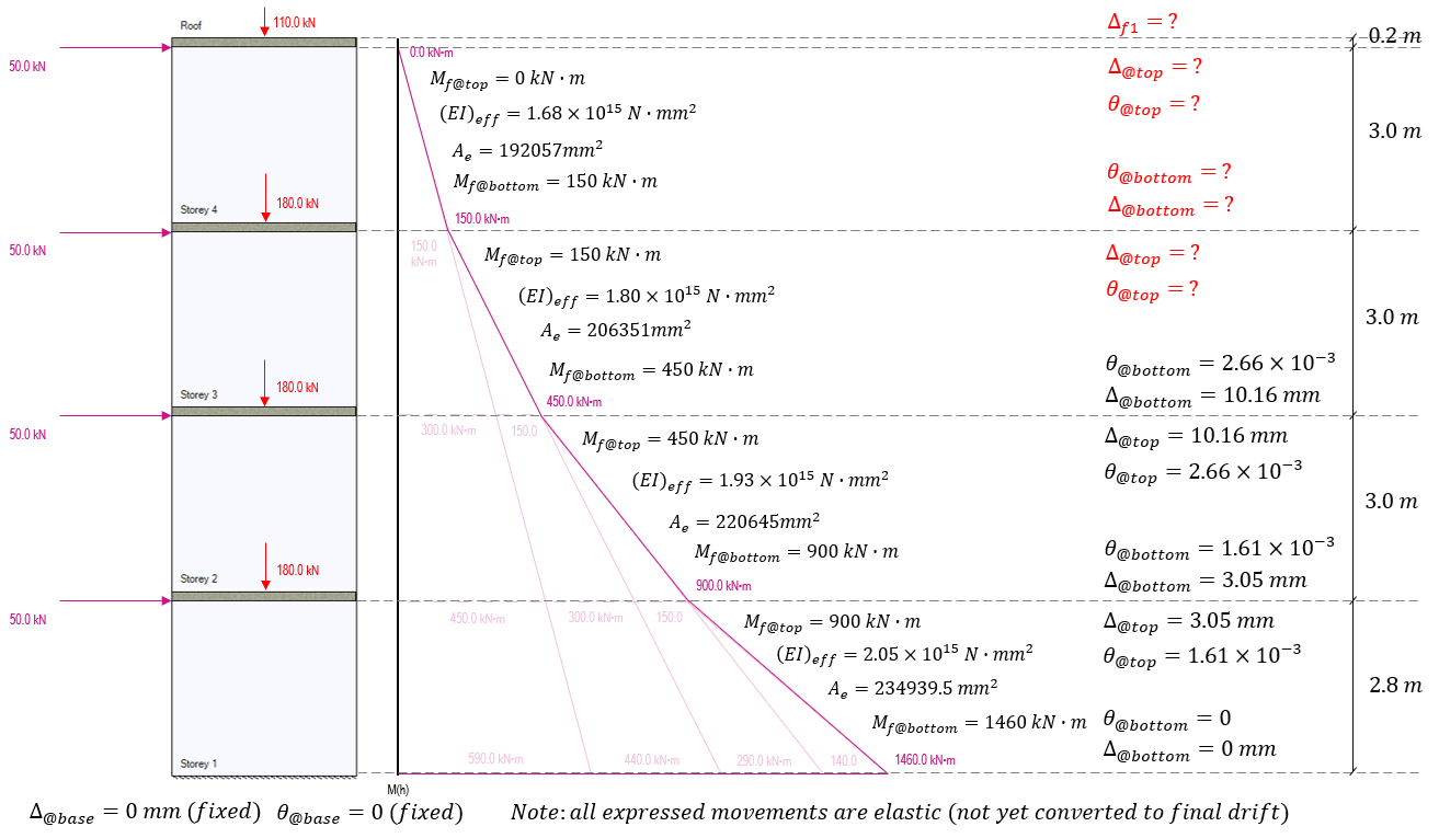 Adding these results to the diagram, it is important to note that while the elastic rotation and deflection have been calculated for the top of the uppermost storey, this does not equal the deflection at the top of the shear wall.