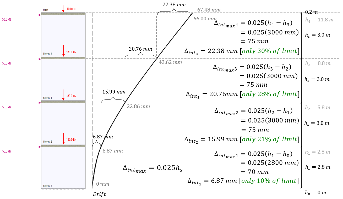 In this example, the inter-storey drift is well within the allowable limits for each floor.