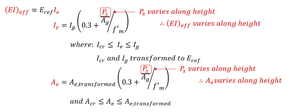 Before proceeding with those calculations, the effective stiffness and area must be adjusted. Although the cross section is exactly the same and will have an identical cracked and uncracked moment of inertia, the stiffening effects will differ as they are a direct function of the axial load acting at those locations. This same logic applies to the calculation of the effective area.