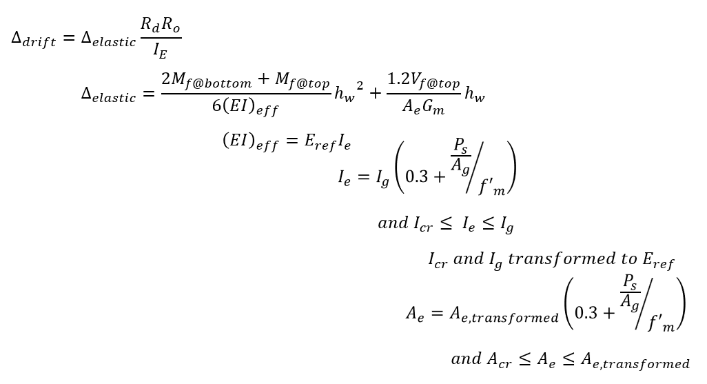 The final deflection value determined by MASS for a masonry shear wall is equal to the initial deflection multiplied by the overstrength and ductility SFRS modification factors and then divided by the importance factor. The initial deflection is determined using basic structural mechanics using linear elastic behaviour, based on distributed loading as well as an effective stiffness and effective area outlined in CSA S304-14[16.3.3]. This effective stiffness can vary along the height of the wall (if looking at a multi-storey design) and can have a value between the cracked and uncracked shear wall stiffnesses, as a function of axial load. The same applies to the effective area.